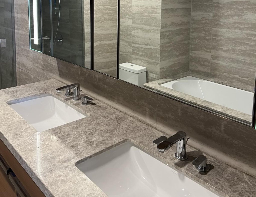 * Luxe wood paneling and marble finish