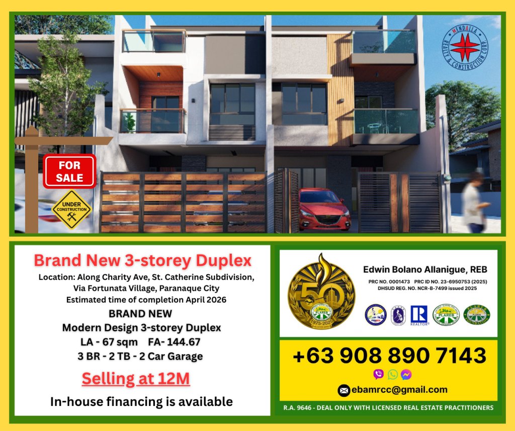 This brand-new 3-story duplex is currently under construction. This is located along Charity Avenue, St. Catherine Subdivision, via Fortunata Village, ParaƱaque City. Approximately 400 to 500 meters away from Dr. A. Santos Avenue, McDonald's, and WalterMart Sucat.