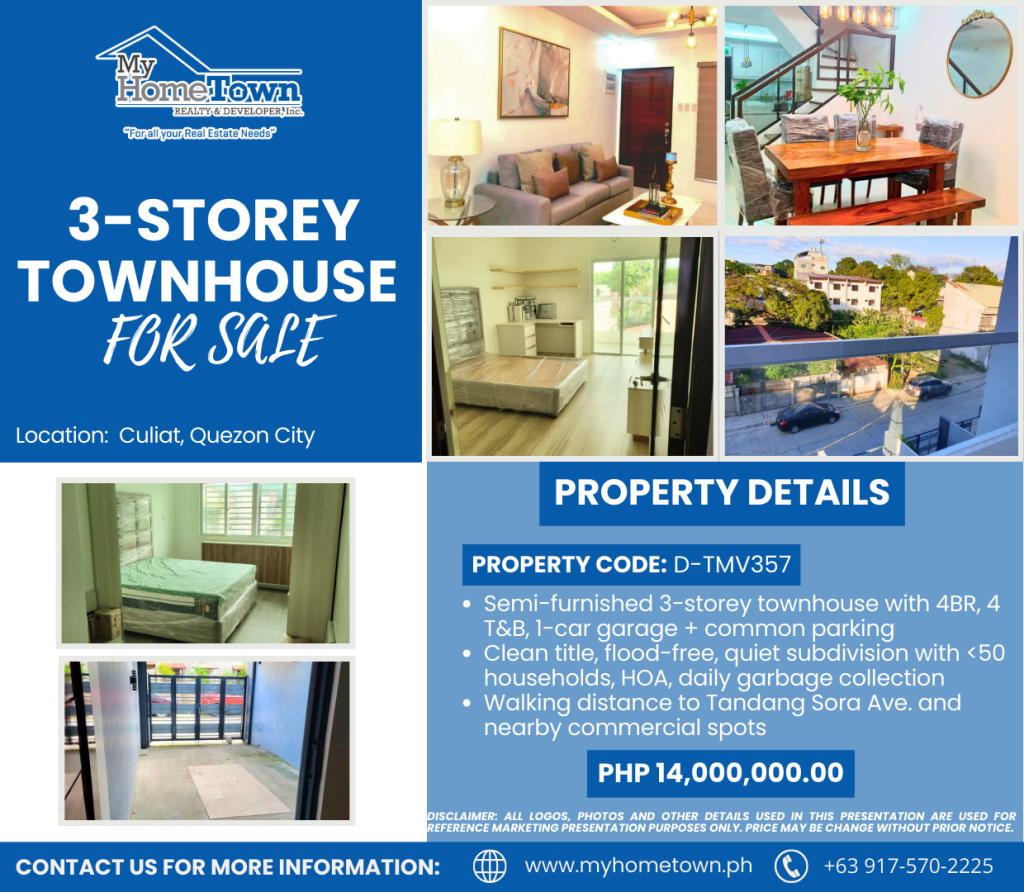FOR SALE: Three-Storey Townhouse – Culiat, Quezon City